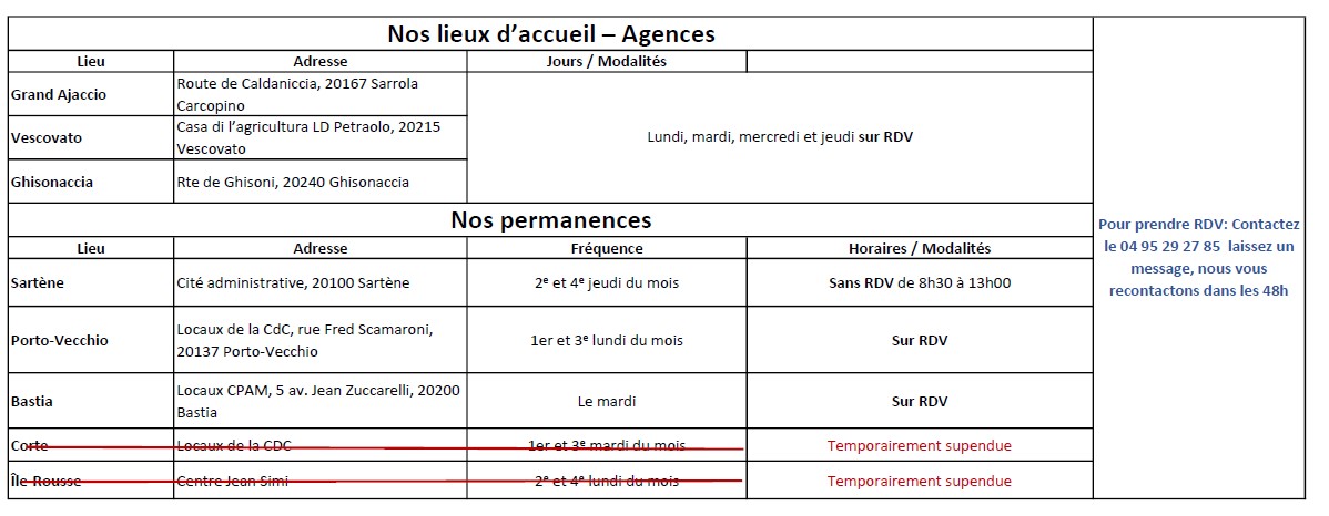 Différents lieux d'accueil pour vous recevoir et répondre à vos questions. Pour nous joindre : - nous joindre au 04.95.29.27.18 ou - nous contacter via votre espace privé